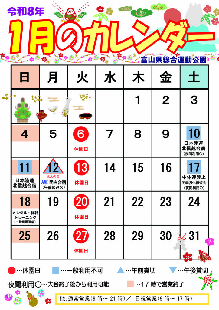■陸上競技場:1月の予定■ イベントカレンダー X Facebook はてブ Pocket LINE コピー 2025.12.25 いつも富山県総合運動公園をご利用いただきありがとうございます。陸上競技場の1月の予定表です。※予定は変更される場合がございます。ご了承ください。