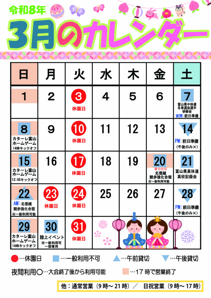 ■陸上競技場:3月の予定■ イベントカレンダー X Facebook はてブ LINE コピー 2026.02.26 いつも富山県総合運動公園をご利用いただきありがとうございます。陸上競技場の3月の予定表です。※予定は変更される場合がございます。ご了承ください。