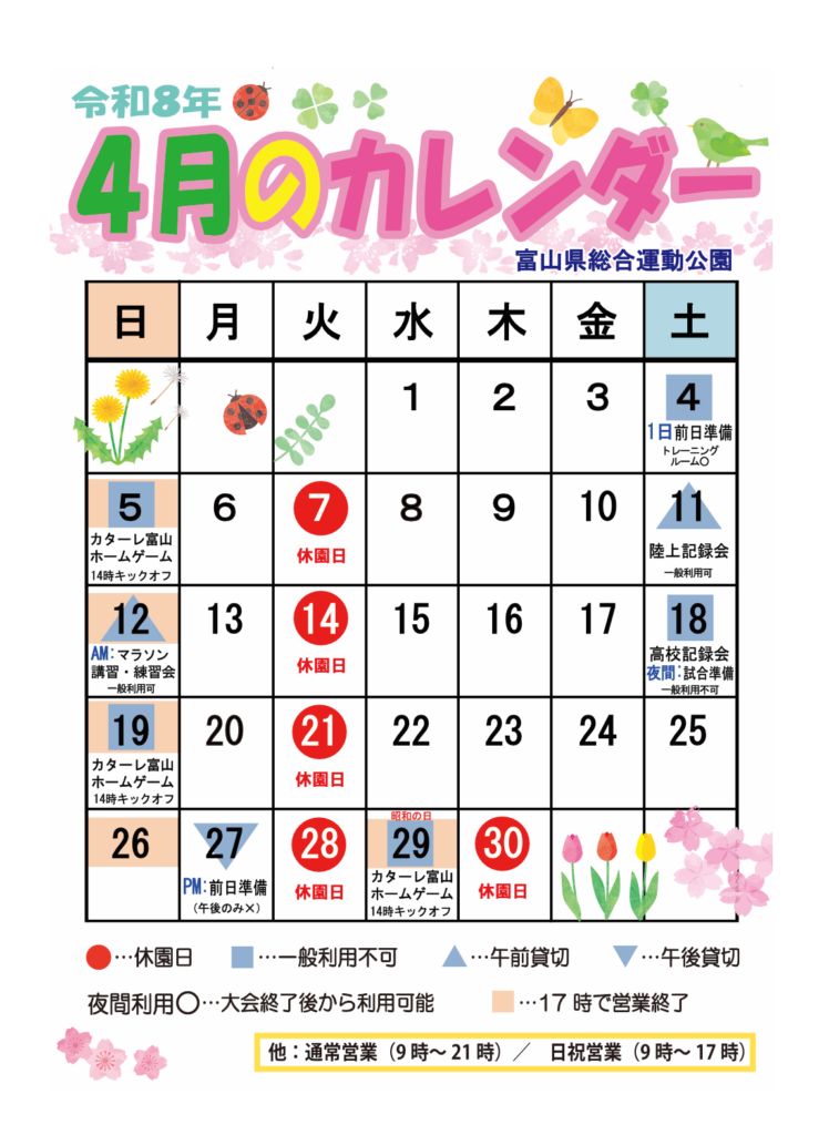 ■陸上競技場:4月の予定■ イベントカレンダー X Facebook はてブ LINE コピー 2026.03.30 いつも富山県総合運動公園をご利用いただきありがとうございます。陸上競技場の4月の予定表です。※予定は変更される場合がございます。ご了承ください。