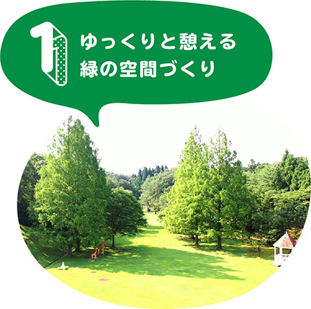 豊富な経験・ノウハウにより、高品質な芝生をはじめ、バーベキューなどが楽しめる快適な樹下空間や、四季折々の花木による調和のとれた空間など、緑の下で憩いの空間を作っています。