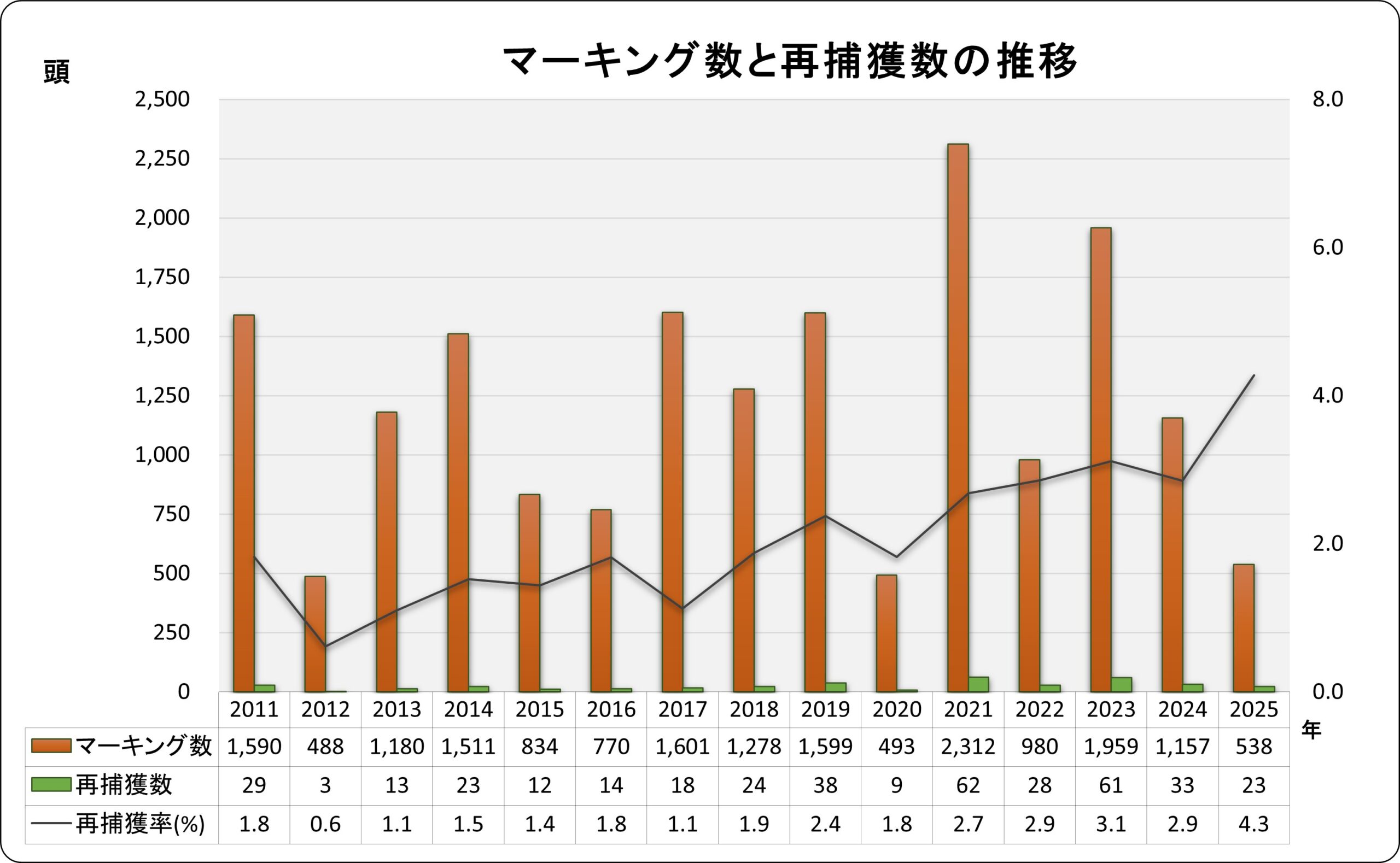 - 県内マーキング個体が再捕獲された数