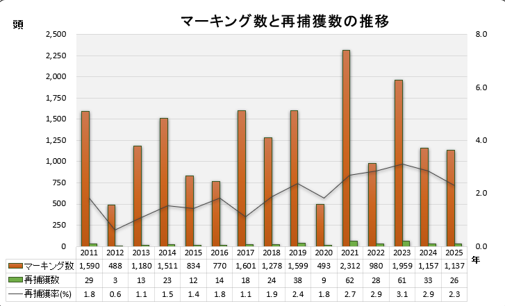 県外マーキング個体が再捕獲された数