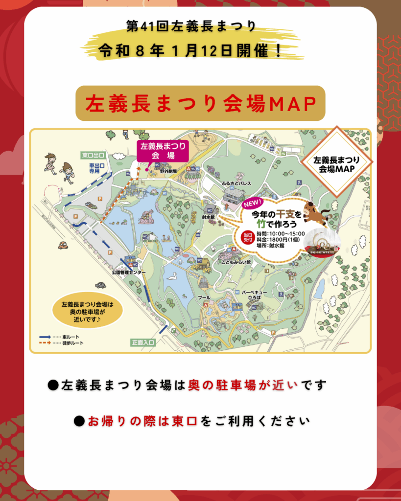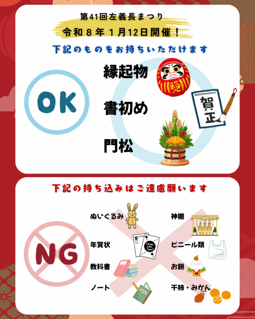 | イベント概要 | 昔からお正月の行事として続いている左義長。左義長は無病息災、学業成就、家内安全を願って書初め・しめ飾り・門松などを持ち寄って焚き上げる行事です。 ※環境保全対策として、ビニール・プラスチック・もち・干柿・みかんは持ち込まないでください。 |