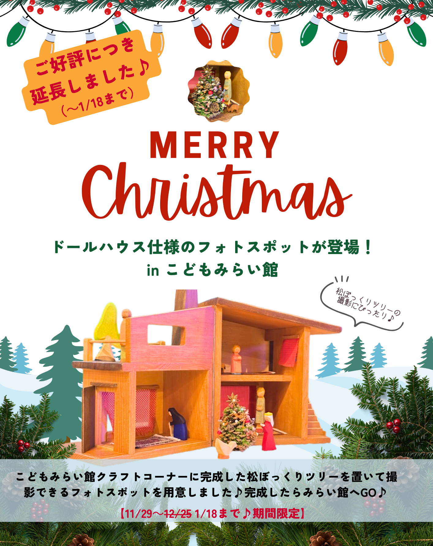 ≪ご好評につき延長しました≫ドールハウス仕様のフォトスポットがこどもみらい館に登場!松ぼっくりツリー撮影にピッタリ♪