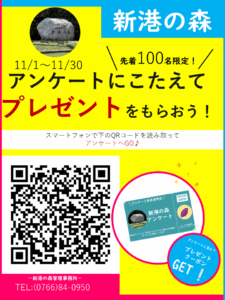 アンケート回答後、新港の森管理事務所へご来所いただければ、先着でプレゼントをお渡しします。
