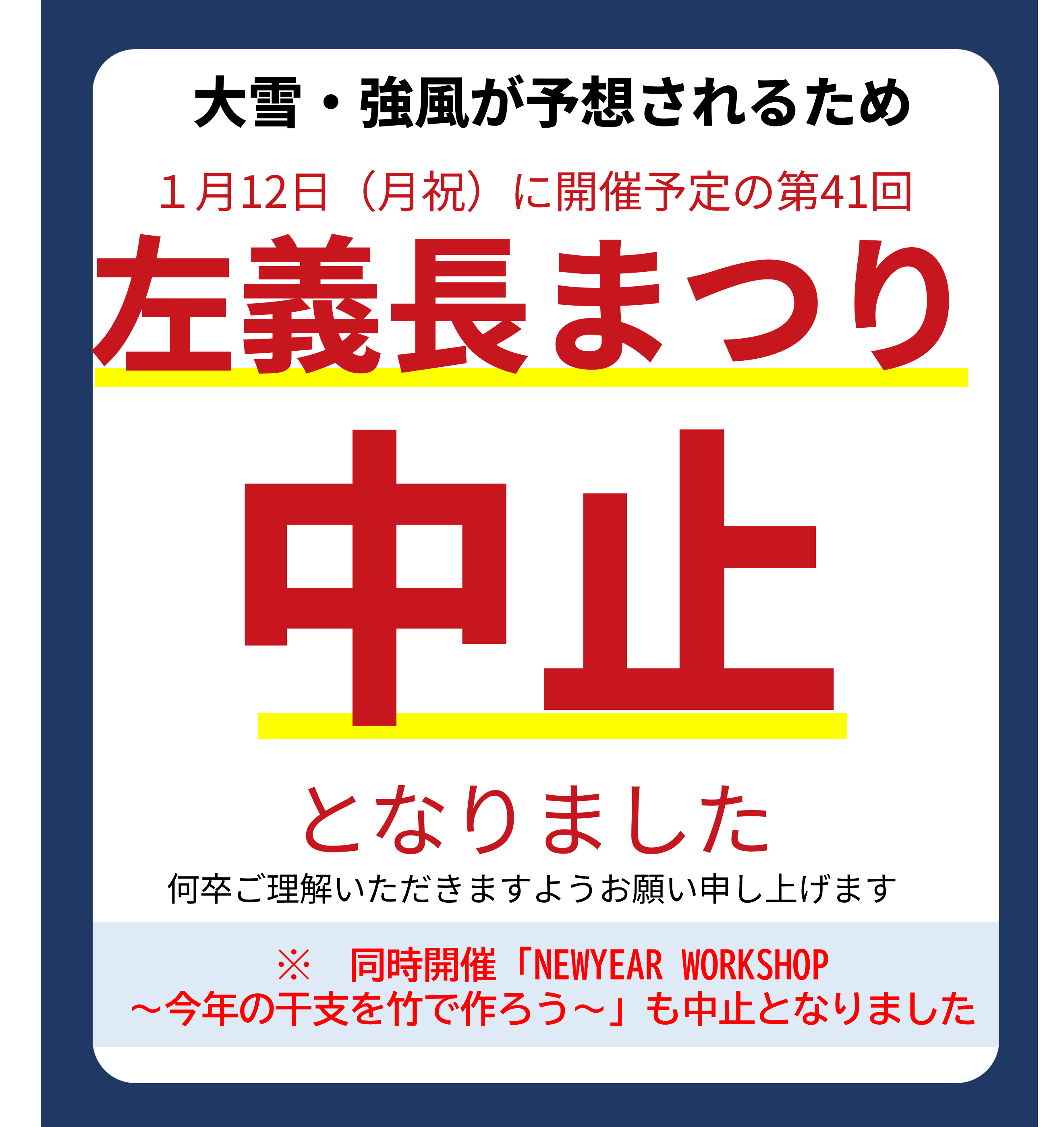 大雪・強風が予想されるため、1月12日(祝)に開催予定の「第41回左義長まつり」は、中止となりました。