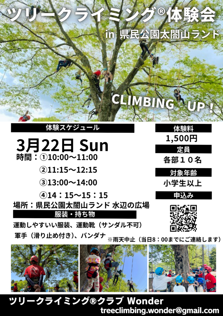 | イベント概要 | 太閤山ランドでツリークライミングを楽しもう! ツリークライミングをとおして、木や森、自然との一体感を味わいませんか? 樹上から、今までとは違う視点で森を見てみては。 〇開催場所:水辺のひろば 〇スケジュール:定員10名/回 ①10:00~11:00 ②11:15~12:15 ③13:00~14:00 ④14:15~15:15 〇参加料:1,500円(対象は小学生以上、保険料、レンタル料込) 〇服装:運動しやすい服(長ズボン)、運動靴(サンダル不可) ○持ち物:軍手(滑り止め付き軍手)、バンダナ等ヘルメットインナー 〇事前予約あり ※雨天時は中止となる場合があります。 (当日8時までご連絡いたします) |