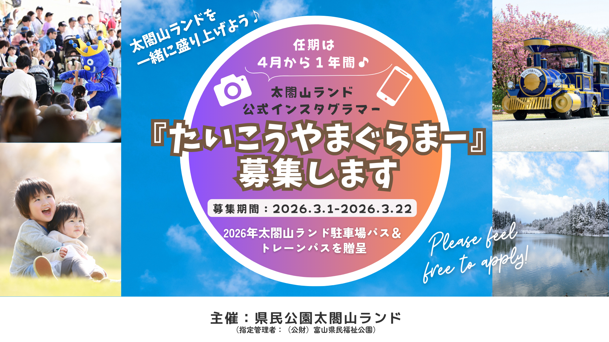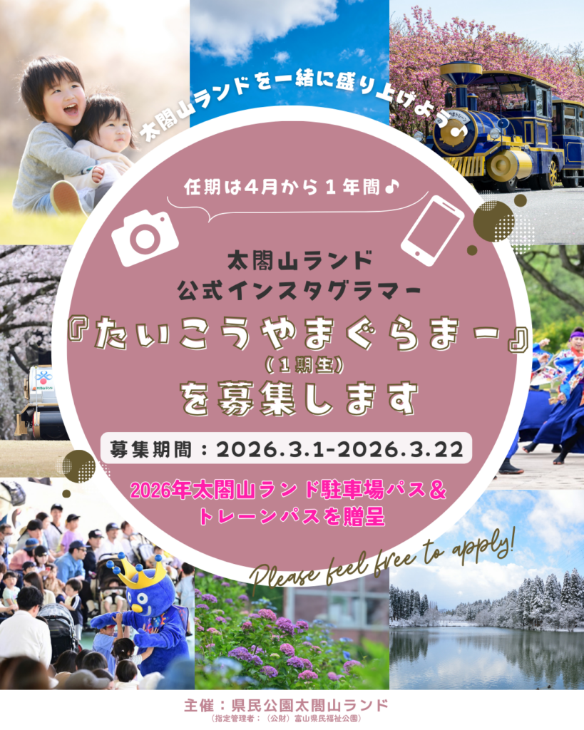 Instagramで活躍いただける太閤山ランド公式インスタグラマー『2026たいこうやまぐらまー(第1期生)』を募集します。