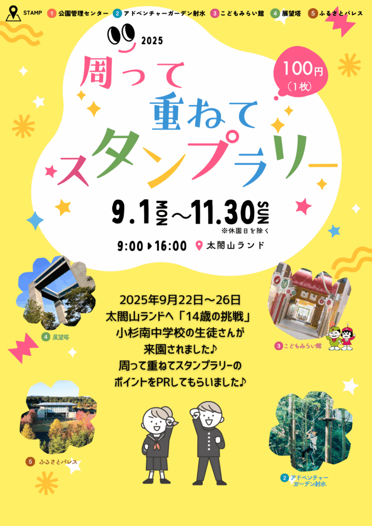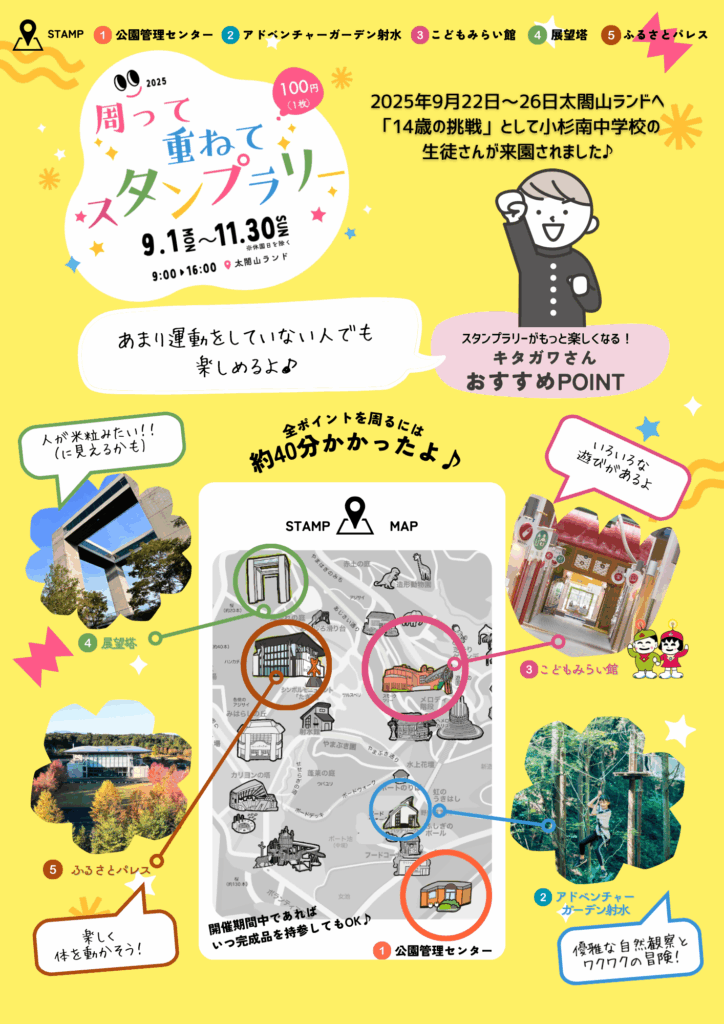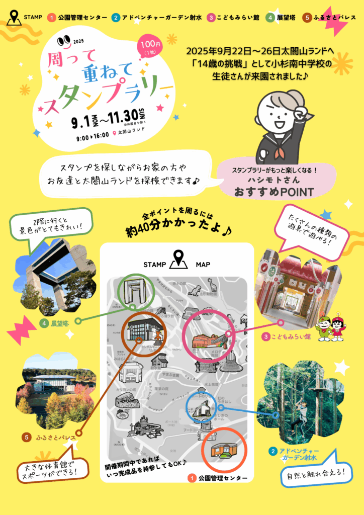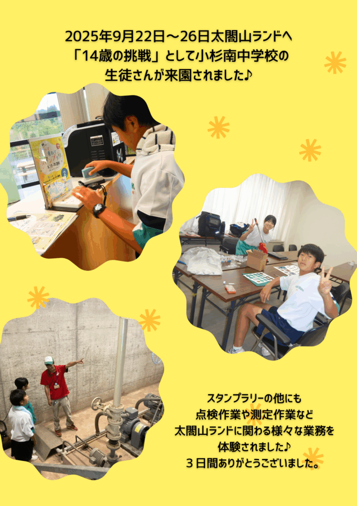 2025年9月22日~26日太閤山ランドへ「14歳の挑戦」として小杉南中学校の生徒さんが来園されました。周って重ねてスタンプラリーのポイントをPRしてもらいました♪