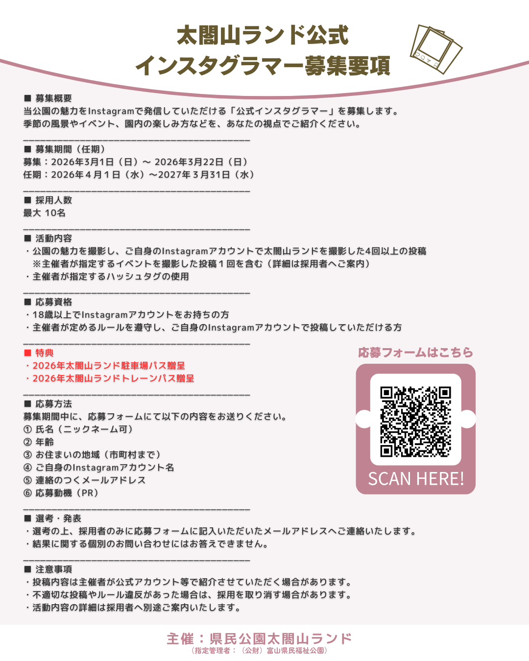 Instagramで活躍いただける太閤山ランド公式インスタグラマー『2026たいこうやまぐらまー(第1期生)』を募集します。